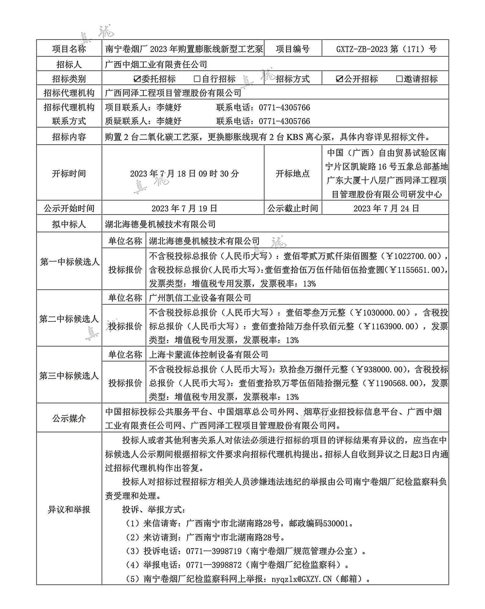 廣西中煙工業(yè)有限責任公司南寧卷煙廠2023年購置膨脹線新型工藝泵(項目編號:GXTZ-ZB-2023第(171)號)中標候選人公示